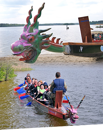 Pływanie smoczymi łodziami to niezwykle emocjonujący i widowiskowy sport drużynowy wywodzący się z Chin. Osadę każdej ozdobionej charakterystycznym smoczym łbem łodzi – w zależności od jej długości – może tworzyć nawet 20 wioślarzy. Skład osady uzupełnia bębniarz nadający rytm jej pracy oraz instruktor pełniący rolę sternika. Wyścigi smoczych łodzi to znakomita forma rywalizacji pomiędzy zespołami, która wymaga od ich członków ścisłej współpracy i sprzyja integracji. W zależności od Waszego zapotrzebowania, mogę przygotować wyścigi, krótko- i długodystansowe, wyprawy lub inne formy rekreacji z wykorzystaniem smoczych łodzi.